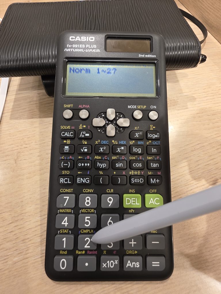 화면에 ‘Norm 1~2?’라는 메시지가 뜨면, 숫자 [2] 버튼을 누릅니다. 이제 계산기는 웬만큼 작은 숫자도 지수 대신 소수점으로 보여줄 준비가 되었습니다.